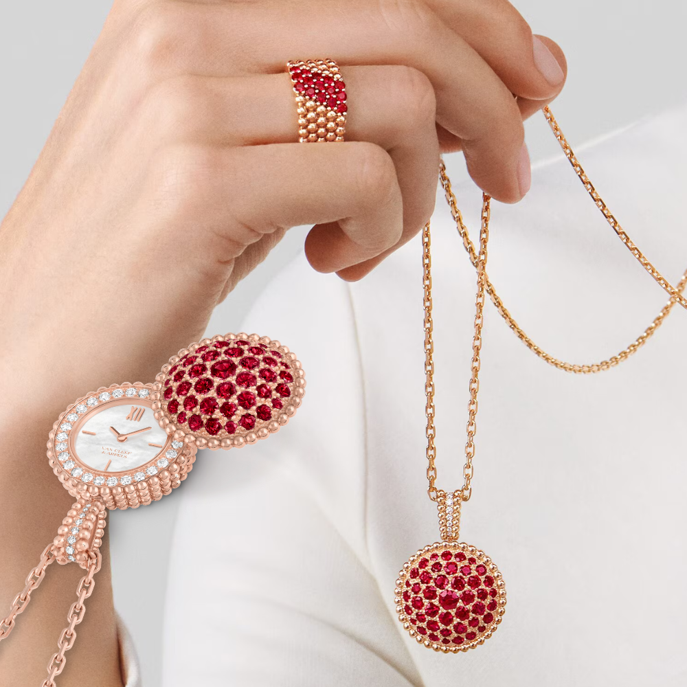 Crafted in 18-carat rose gold and suspended from a long chain, the pendant opens to reveal a delicate white mother-of-pearl dial. Diamonds and rubies adorn the case and bezel, while the signature Perlée gold beads add a playful, feminine rhythm. A watch, a jewel, and a talisman — all in one.