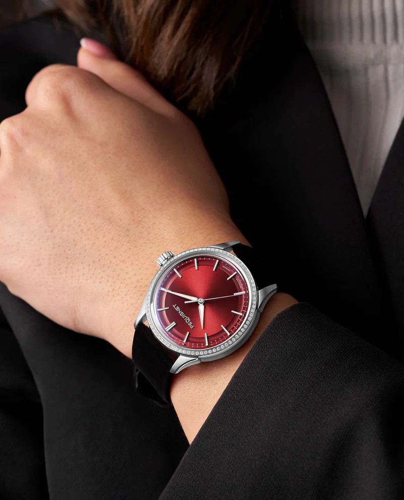 Unveiled in 2026 for Valentine’s Day, the Royale Paris 36 mm Sertie offers a precious new interpretation of PEQUIGNET’s emblematic design. Paired exclusively with a deep bordeaux dial, the bezel is set with 78 diamonds, adding a discreet sparkle that enhances the watch’s refined, architectural lines. With its sculpted case, signature concave lugs, and slim 8.95 mm profile, the Royale Paris remains effortlessly elegant on the wrist. Inside, the manufacture Calibre Initial®, designed and assembled in France, delivers a 65-hour power reserve and exceptional precision. A refined Valentine’s gift that combines modern French watchmaking with understated luxury.