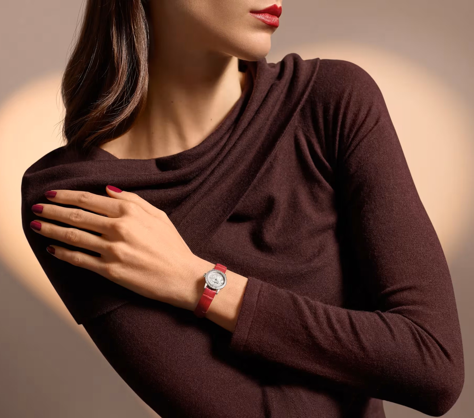 Its 21.5 mm case houses an exceptionally small automatic movement, a testament to Blancpain’s historic mastery of miniaturisation. The pearlised mother-of-pearl dial — among the rarest and most fragile used in watchmaking — is framed by a diamond-set bezel and punctuated by a heart-shaped diamond at twelve o’clock. A red “Chérie” alligator strap adds a bold romantic touch, while a heart engraved on the oscillating weight remains a secret detail, visible only to its wearer.