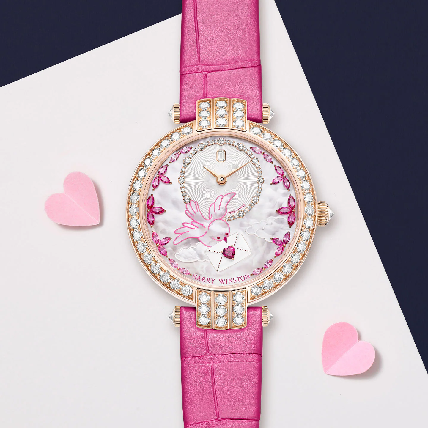 The dial shimmers with iridescent pearl mother-of-pearl, illuminated by diamonds, pink sapphires, and rubies. The case is set with 57 brilliant-cut diamonds, while the total gem-setting reaches 114 diamonds, alongside carefully selected coloured stones. Powered by an automatic movement and paired with a pink satin alligator strap, this ultra-limited creation is a rare and poetic tribute to love.